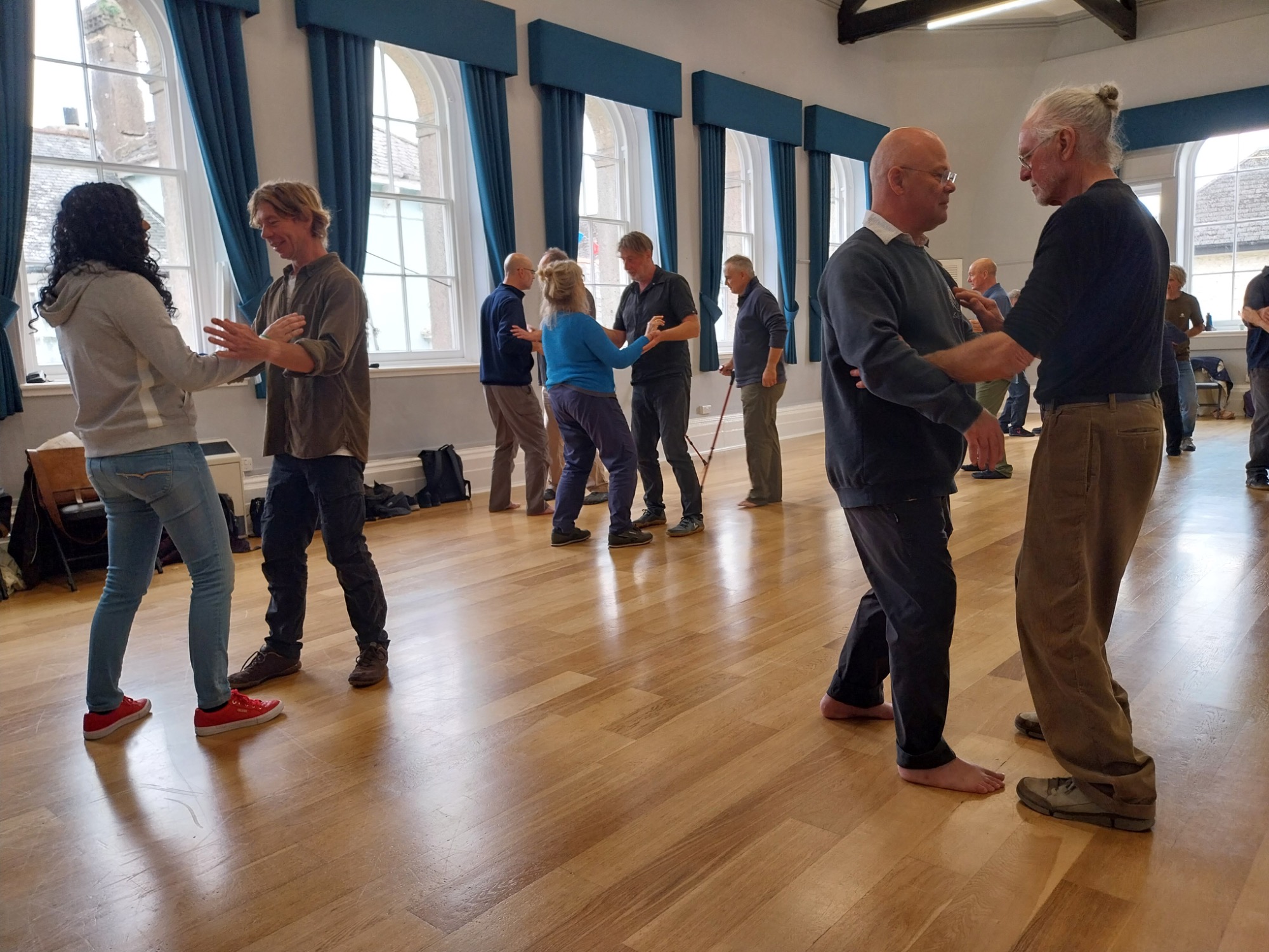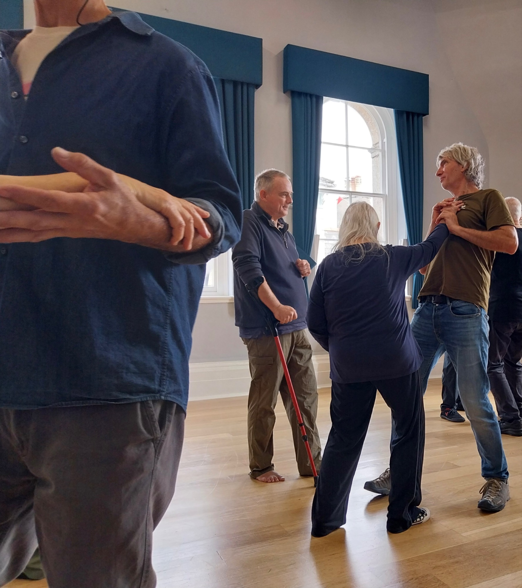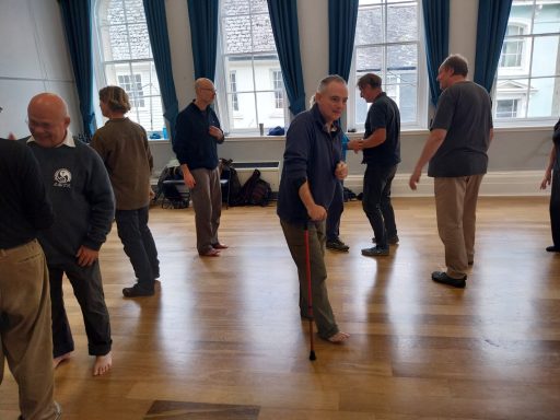 We always begin with a quietening down of the active superficial mind. ……some gentle stretches then into the 5 main Loosening Exercises developed by Huang Shen Shyan.